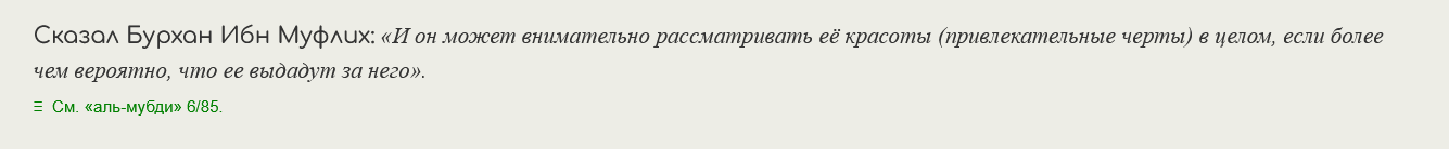 «То, в чем успокаивается душа – что человек когда отправился свататься к женщине, то она показывает ему лишь лицо и кисти рук, как сказало большинство ученых, и лишь когда он спрятался – он может посмотреть на то что зовет его к браку с ней. Ведь не укладывается в разуме что разумно и по Шариату будет говорить женщине – разденься, чтобы на тебя поглядел сватающийся на что хочет! В таком случае, начнется большое нечестие и фитна на земле!»