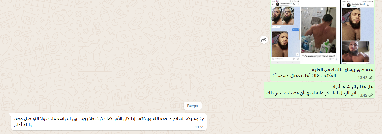 Когда же я показал ему какие изображения Джаузи отправляет в личку своим ученицам заявляя что это сватовство, он сказал что им запрещено учиться у него и вообще писать ему!