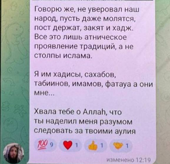 В статье, зная что ее будут читать многие люди и ему могут предьявить, лицемер пишет про учет традиций местности. Но когда к нему в чат заходили люди, и просили прекратить сеять фитну и учитывать традиции, он писал им вот такое:
