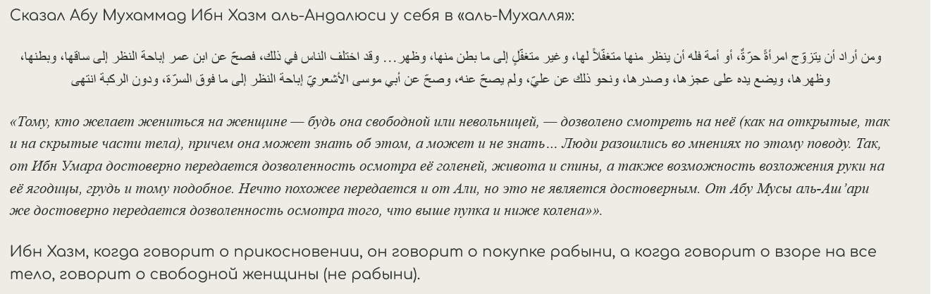 - Так, Джаузи упомянул от Камаля Сейида, автора книги по сравнительному фикху, что он дозволяет смотреть на невесту со страстью, что не требуется согласия опекуна, однако «забыл» указать, что Камаль Сейид не дозволяет смотреть ни на что, кроме лица и кистей рук!! (см. «Сахих фикх ас-Сунна», стр. 120)