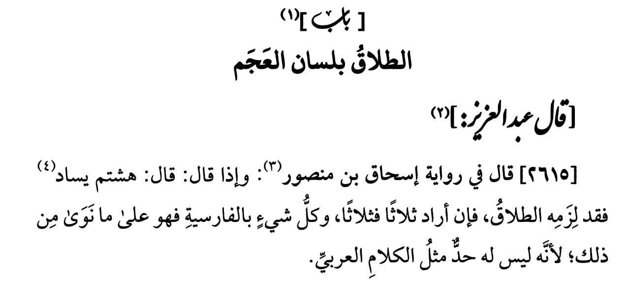 Сказал Гулям аль Халляль: "Сказал имам Ахмад в передаче Исхака Ибн Мансура: "И когда человек скажет: "Хаштам Ясад" - то случился его таляк, а если имел ввиду тройной, то тройной.