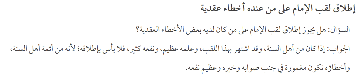 И также: неправильно то, что когда их упоминают, то перед их именем ставят выражения почтения и уважения, которые не произносятся иначе как в отношении проверенных имамов Сунны: говорят «имам» или «имам ахлю Сунна» или подобное. Это тоже из ошибок.