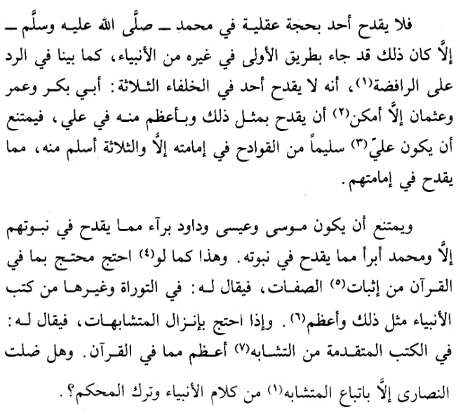 «Так никто не порочит Мухаммада ﷺ на основании какого-либо довода разума, кроме как это же порочение тем более будет направлено к другим пророкам ещё сильнее, как мы уже разъяснили в опровержении рафидитов: что никто не порицает трёх халифов - Абу Бакра, Умара и Усмана — кроме как можно привести такой же довод и ещё больший против Али.